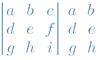 그 다음 검은 대각선 3개의 성분을 곱한 뒤 더하고 빨간 대각선 3개의 성분을 곱한 뒤 더하여 뺀다.
