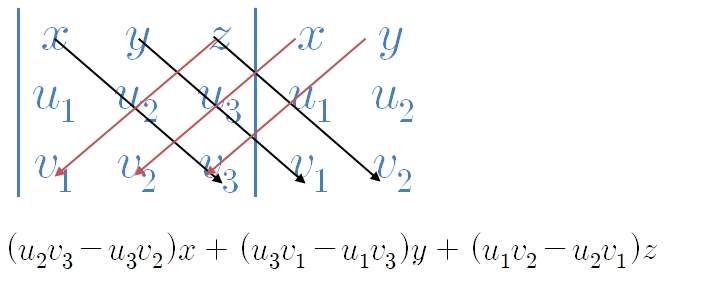 첫쨰 줄에 x , y , z 를 적고 둘째 줄에 u벡터를, 셋째 줄에 v 벡터를 적어 그 3x3 행렬의 행렬식을 구한다.